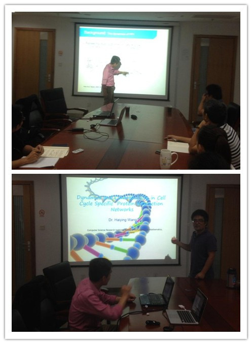 报告会上,Haiying Wang教授首先系统地介绍了了蛋白质相互作用网络动态组织规律的研究背景,接着介绍了以酵母细胞周期实验数据驱动的动态过程研究,以及在细胞周期生物过程中两类hub基因(data hub和party hub)起到的作用和各自特点,最后介绍了基于minimum dominating set方法所识别出的关键蛋白(critical protein)和多余蛋白(redundant protein)在蛋白质相互作用网络中的拓扑结构特点、基因组中的必要性、功能相似性和在网络中的恢复力。报告过程中,我院学生与Haiying Wang教授交流充分,气氛热烈。
