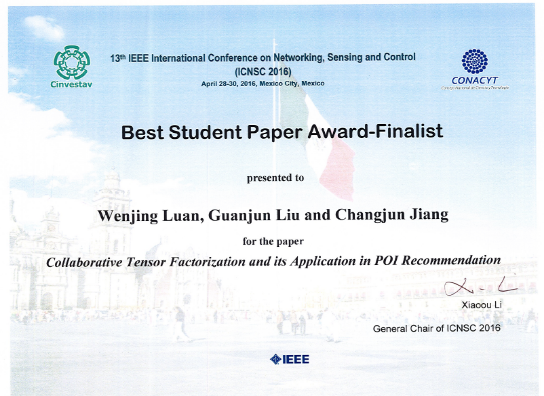 4月28日-30日,在墨西哥城召开的第13届IEEE ICNSC国际学术会议上,我院计算机科学与技术系博士生栾文静等完成的学术论文被授予“最佳学生论文提名奖”(Best Student Paper Award-Finalist)。