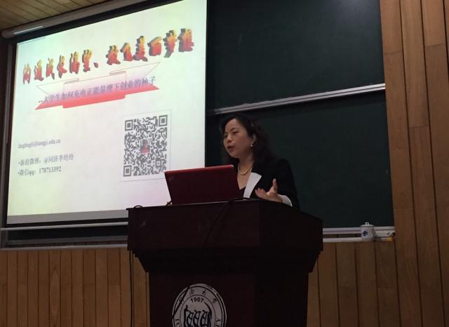活动伊始,由我校创业管理教育研究中心主任李玲玲副教授与同学们分享了《大学生如何充电正能量,埋下创业的种子》的主题演讲,李老师借用电气专业的术语生动演绎了创新创业成长七关键因素RLC模型即:目标、情绪、自我、沟通、链接、开关、能量,接着她重点阐释了目标设定的重要性以及如何把握人生成功的重要要素。李老师富有激情的演讲,激励了同学们勇敢的放飞美丽梦想。据悉,李玲玲老师同时也是教育部创业项目指导委员会专家委员、联合国工业发展组织创业导师教练、00创新创业同频港湾(公益平台)创始人,2016年以教育者身份载入联合国工发组织女性成功创业者故事榜(《Women Entrepreneurs. Women Empowered》)。