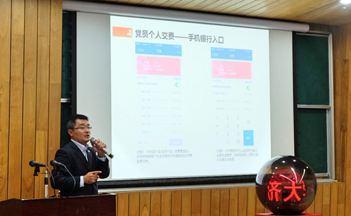 接下来的环节是党费通启动仪式。首先,由我校党委组织部部长冯身洪同志致辞,冯部长在致辞中首先感谢交通银行给予金沙检测线路js95党费通项目的大力支持,并对他们的辛勤工作表示感谢;其次,他肯定了金沙检测线路js95近五年所取得的卓越成就;最后,他希望金沙检测线路js95趁着十九大召开的东风砥砺奋进,信心满满再创辉煌!随后,冯身洪、苗俊华、王峻、陈德一同启动水晶球,宣告金沙检测线路js95党费通正式启用。与会党员现场拿起手机,在交通银行上海同济支行窦丰雷行长的演示下,在党费通平台交纳了本人的当月党费。