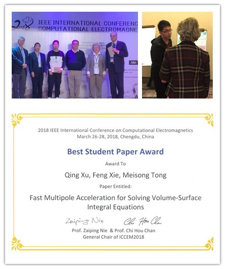 近日,我院电子科学与技术系2017级硕士研究生徐卿受邀参加在成都举办的国际著名学术会议“2018 IEEE International Conference on Computational Electromagnetics (2018年IEEE计算电磁学国际会议)”,他在专门设置的“Competition for the Best Papers of Students(学生最佳论文竞赛)”分会场作了题为“Fast Multipole Acceleration for Solving Volume-Surface Integral Equations(求解体–面积分方程的快速多极子加速方法)”的海报展示,受到竞赛评委和观众的好评,事后被多位国际著名教授誉为“interesting work”及“excellent job”。